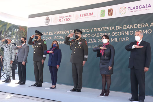 La gobernadora Lorena Cuéllar Cisneros asistió a la ceremonia de la toma de posesión y protesta de bandera del General de Brigada Diplomado de Estado Mayor, Gumaro Cabrera Osornio, como nuevo comandante de la 23 Zona Militar, ubicada en el municipio de Panotla.
